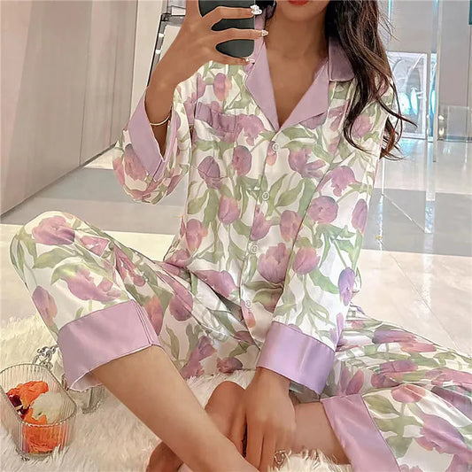 Our calofe Pajamas Set for Women Luxurious Sweet Satin Pajamas Woman Long Sleeve Long Pant Home Wear Ladies Sleepwear Sets Female
